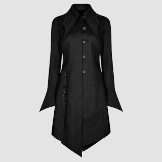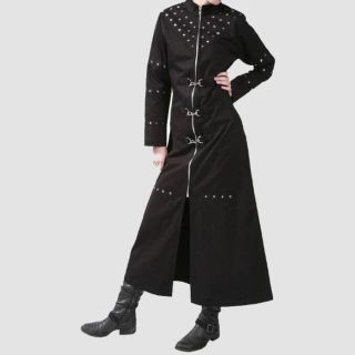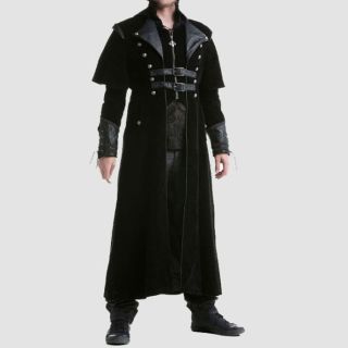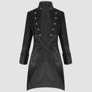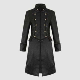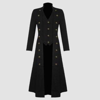 Introducing our Dark Gothics Goth Men’s Steampunk Army Black Jackets, a masterpiece of punk elegance and regency style. This long coat exudes sophistication with its double-layered back shoulder design and elegant metal buttons adorned with a brocade pattern on the inner vest. Crafted from 100% cotton, it offers both style and comfort. Featuring two side slit pockets and an inside pocket, this coat is as practical as it is stylish. For maintenance, dry clean only to preserve its impeccable appearance.
